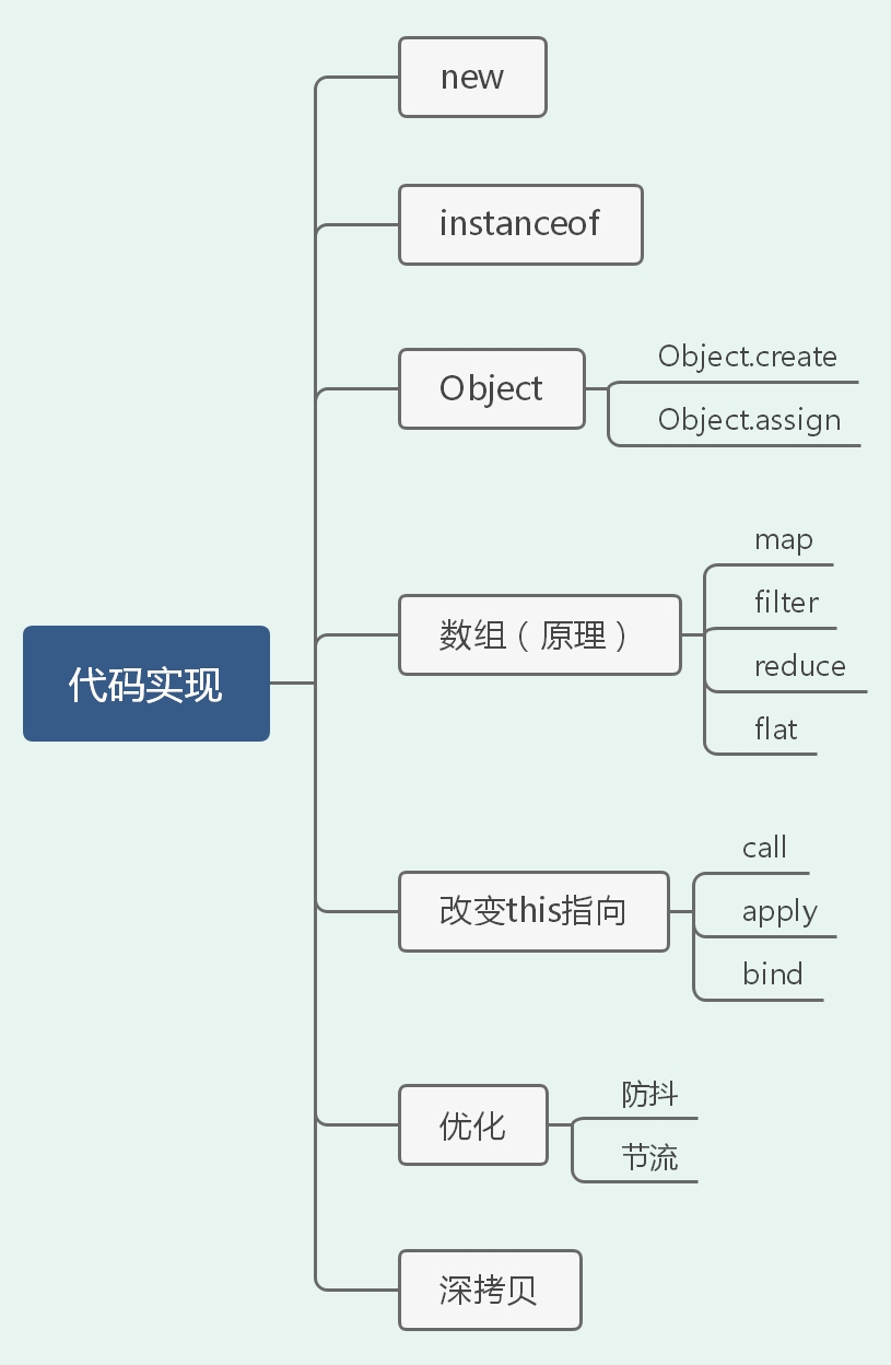使用思维导图来对new、instanceof、Object.create()、Object.assign()、map()、filter()、reduce()、flat()、call()、apply()、bind()、防抖、节流、深拷贝的实现原理进行阐述,然后利用js代码进行实现,为前端切图仔在求职工作中再添一门武功秘籍,提升自身内功。本节为第一节,后面将继续探索Promise、Async、Axios、发布订阅等的实现,请各位大佬关注指正。