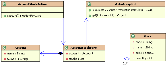 定义了两个属性,分别是一个bean(Account,接受基本信息)和一个List(stocks,接受股票行信息),注意这两个属性必须初始化,不然在表单提交后会出现空指针错误. setStocks方法是让stocks属性永远保有持是一个 AutoArrayList 实例. 这样在表单提交后设置值是总能调用 AutoArrayList 的 get(int index) 方法.
