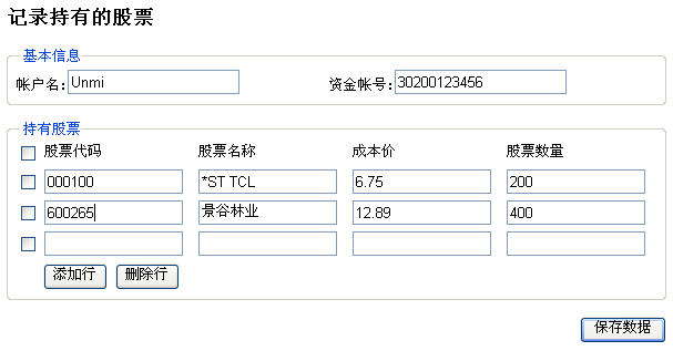 下面举一个如今非常现实的关于股票的例子, 简单的应用场景是: 记录某个帐户所持有的股票信息,提交到后台,然后显示出来. 输入页面如下图