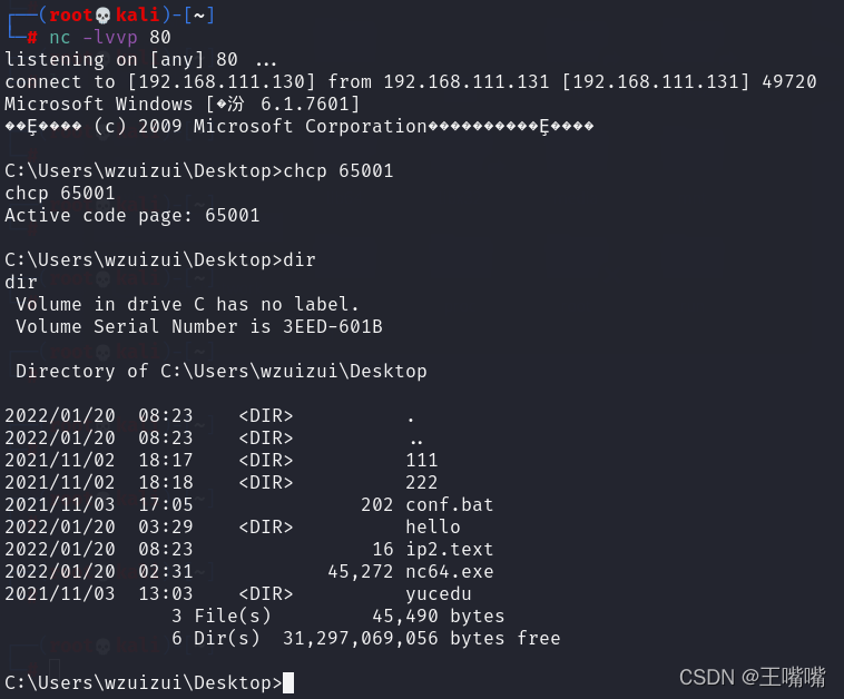 因此win7到kali,出现了乱码,解决方案——chcp命令