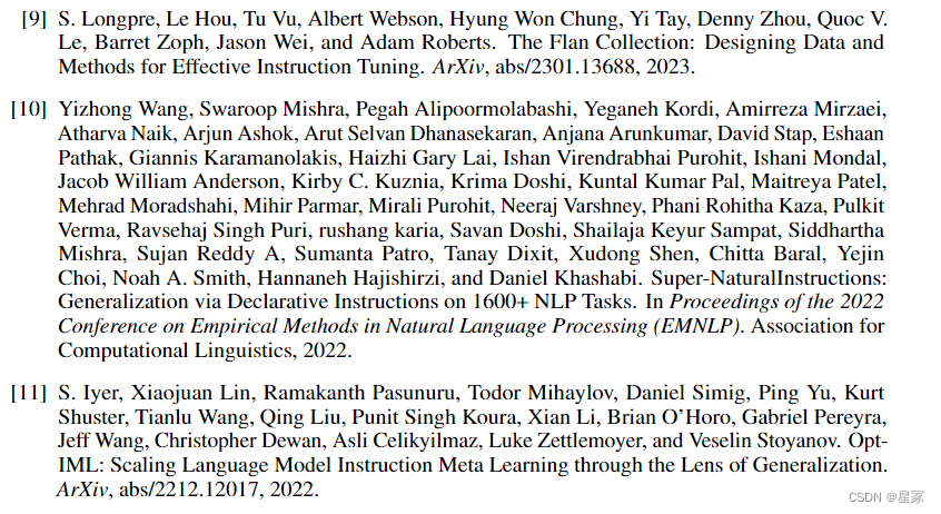 10、11、9等研究工作收集并将传统的NLP任务数据集转化为指令,并在指令数据集上对大型模型进行微调,以提高泛化能力。