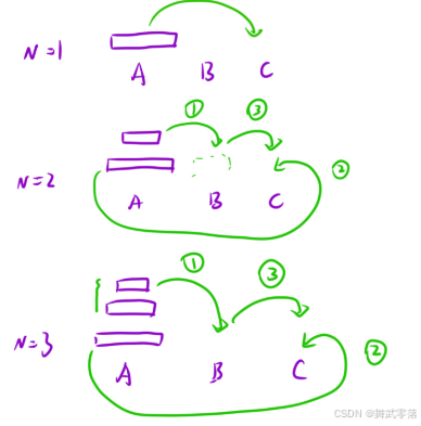 3. 将B柱子上的n - 1盘子借助A移动到C上:dfs(B, A, C, n - 1)
