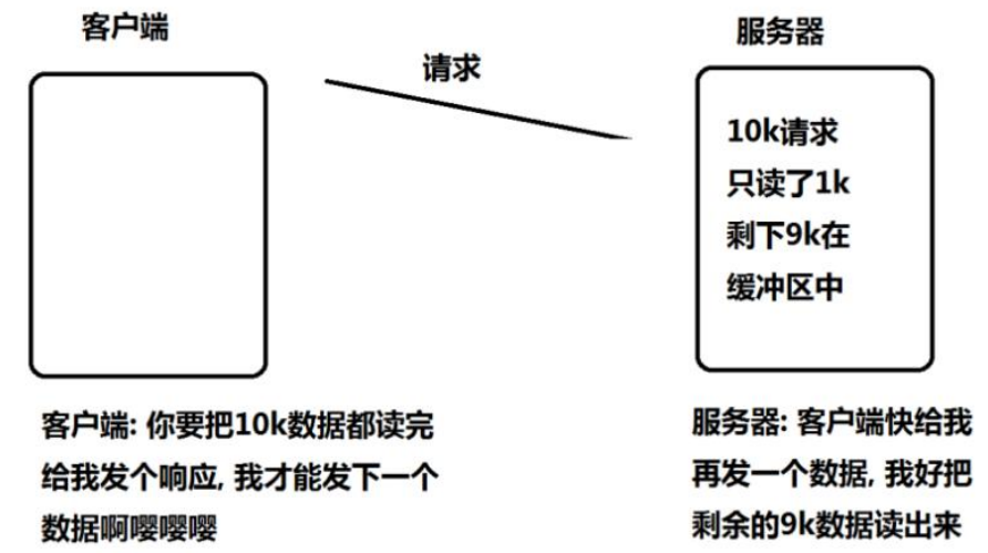 假设这样的场景:服务器接收到一个 10k 的请求,会向客户端返回一个应答数据。如果客户端收不到应答,不会发送第二个 10k 请求。