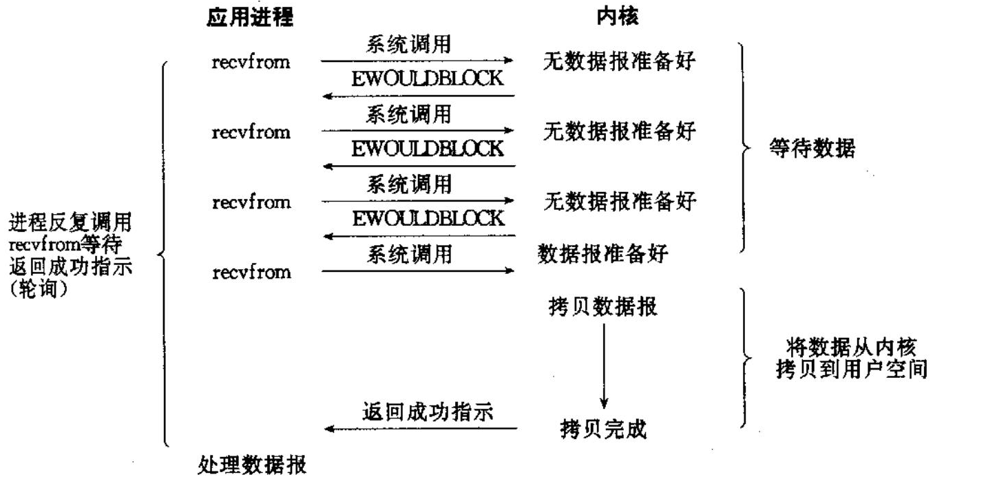 非阻塞 IO:如果内核还未将数据准备好,系统调用不会阻塞,而是立即返回结果,返回EWOULDBLOCK 错误码。