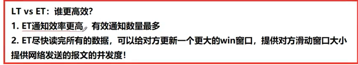 使用 ET 能够减少 epoll 触发的次数。但是代价就是强逼着程序猿一次响应就绪过程中就把所有的数据都处理完。相当于一个文件描述符就绪之后,不会反复被提示就绪,看起来就比 LT 更高效一些。但是在 LT 情况下如果也能做到每次就绪的文件描述符都立刻处理,不让这个就绪被重复提示的话,其实性能也是一样的。