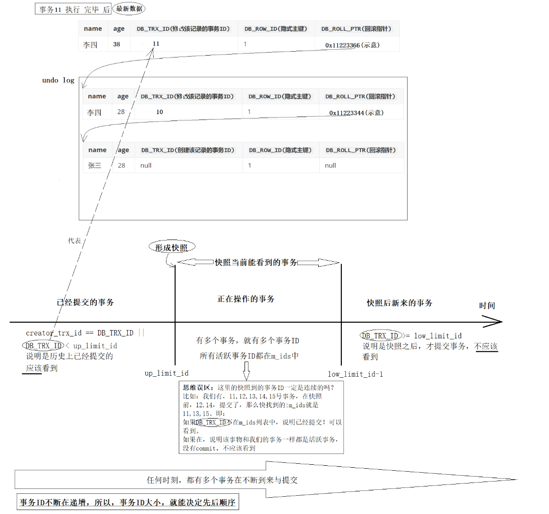 (2)筛选版本:从当前最新记录(DB_TRX_ID=11)开始判断: