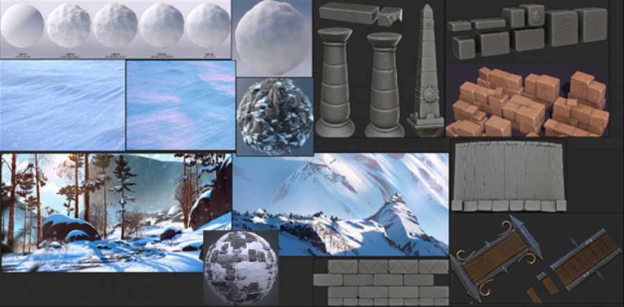 首先我们拿到需求后我们会找到一些实际的参考,石块的细节处理方式、细节大小、雪的堆积方式、雪在阳光下表现出的一些细节等等。