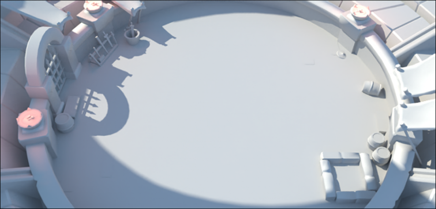 最后场景的视觉层次肯定是在角色之下的,在制作之前就需要把场景的明度、饱和度、对比度这些考虑在内,不停的把这些层级关系贯穿在场景制作当中。中间战斗区域也适当加入了一些细节和材质体现,使得在战斗的时候能突出角色,仔细看又有内容在里面。