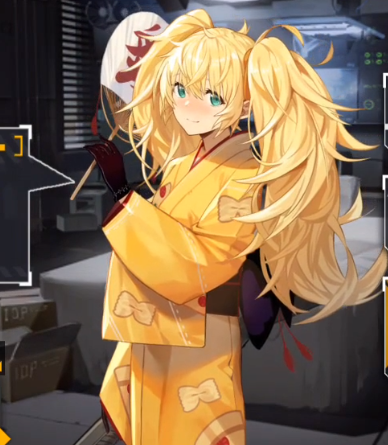 首先,从上图我们看到人物为和风衣着手持团扇,有着一头蓬松金发的少女,衣着细节有蝴蝶型意面和披萨造型,可以考虑角色可能有吃货的属性。