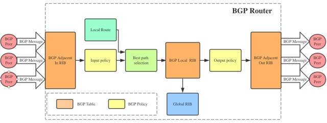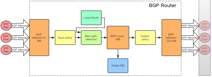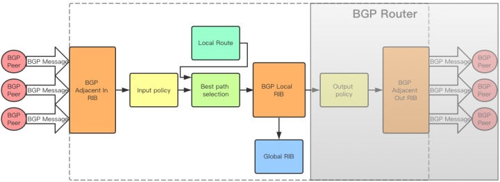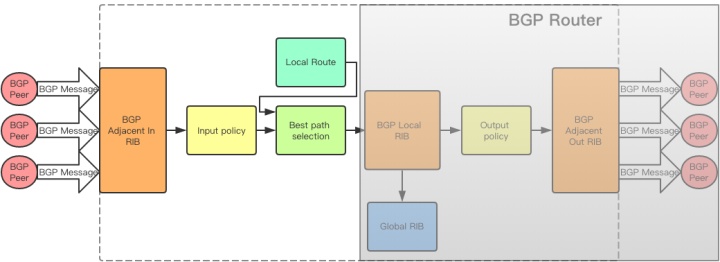 BGP协议收发的数据不会直接写到Global RIB里,而是放到了BGP自己的RIB里面,在适当的时候写入Global RIB,前面说过,这样可以实现数据隔离,有选择的将BGP数据写入主路由表。BGP的三个RIB保存着不同处理阶段的BGP Message,为不同阶段的操作提供数据。接下来过一下BGP路由处理过程。