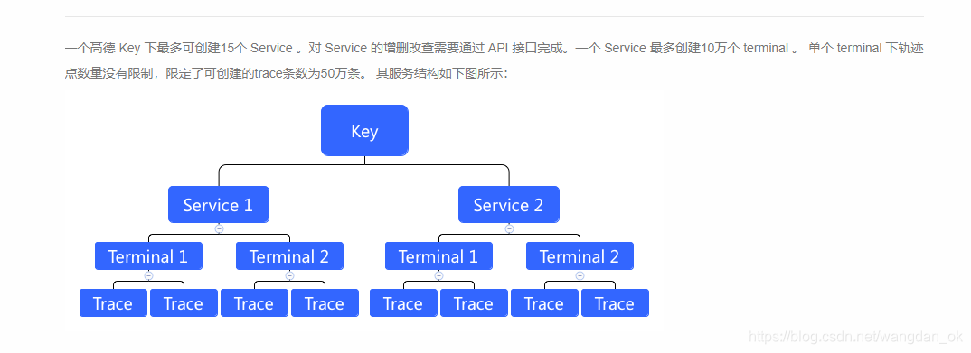 一个service(即鹰眼轨迹服务,其唯一标识为service_id)对应一个的轨迹管理系统,至多同时管理100万个entity(即终端设备)。若需管理超过100万的终端,可创建多个service分别管理。