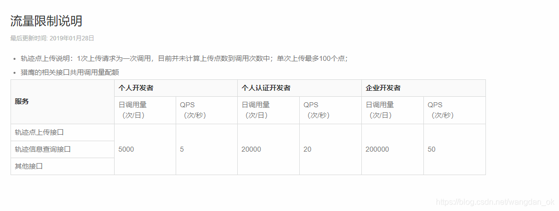 | 高德 | 200000 | 50 | 需要提交工单(待调研) | 没有围栏功能 轨迹分析还没有上线 | 有些服务没有体现(比如创建serviceID需要调研接口,提升额度需要提交工单) | 没有说明 | 25M左右 | 没有web管理页面,支持接口查询 | 功能比较少,基本运行正常 | 一个key下最多15个 一个serviceid最多管理100000终端 |