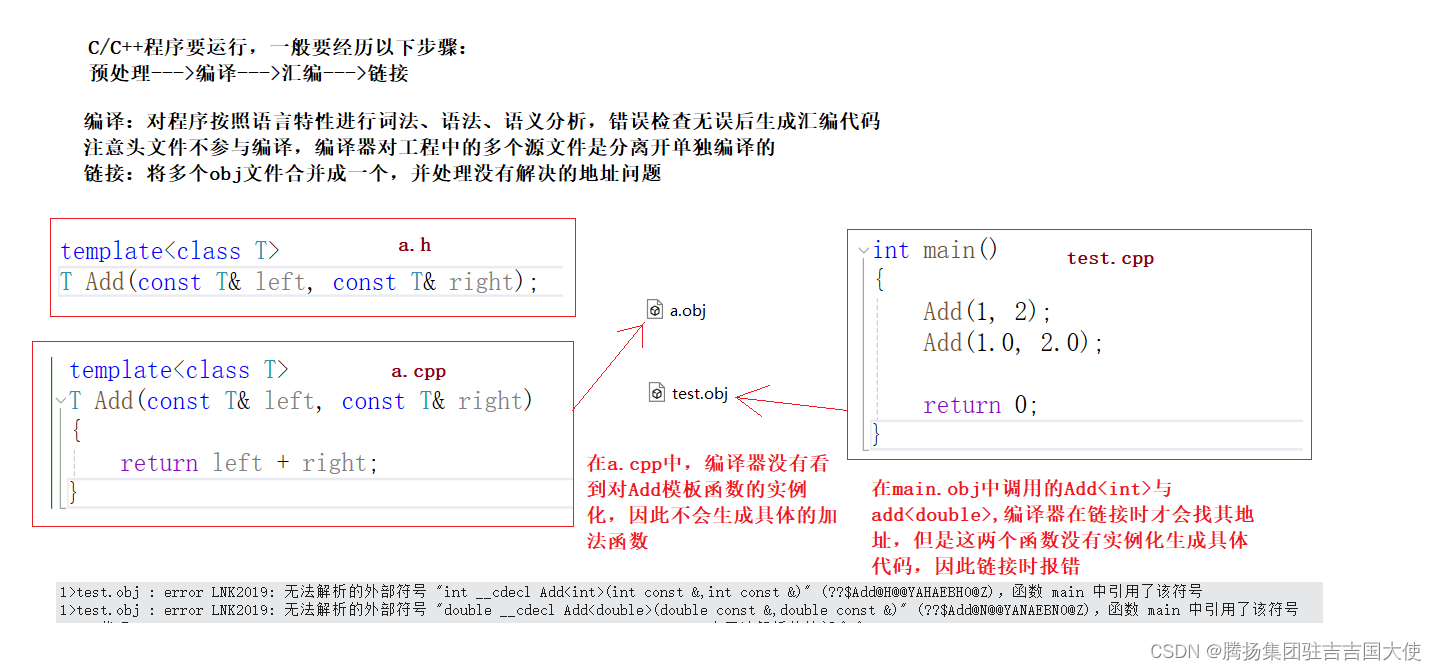 假如有以下场景,模板的声明与定义分离开,在头文件中进行声明,源文件中完成定义: