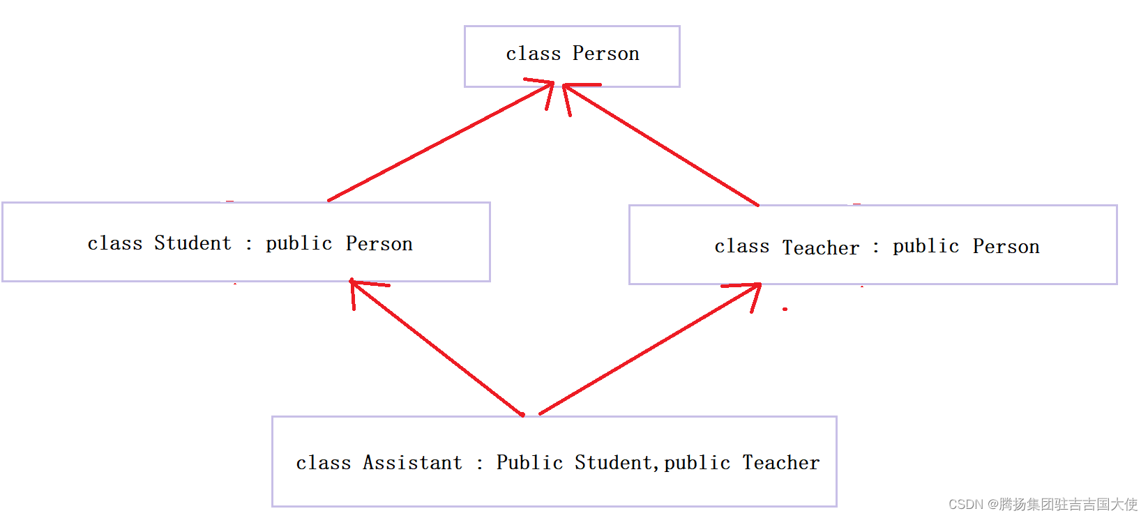 虚拟继承可以解决菱形继承的二义性和数据冗余的问题。如上面的继承关系,在Student和 Teacher的继承Person时使用虚拟继承,即可解决问题。需要注意的是,虚拟继承不要在其他地方去使用。