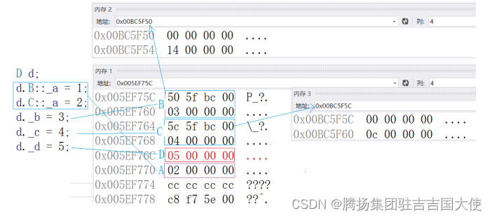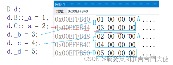 为了研究虚拟继承原理,我们给出了一个简化的菱形继承继承体系,再借助内存窗口观察对象成 员的模型。