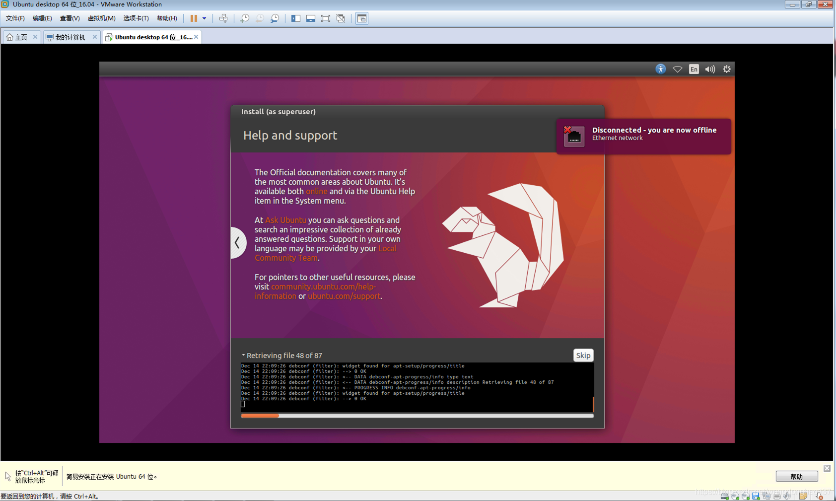 - 这里注意了,点击Retrieving file前的小三角图标,可展开安装命令过程及展开Skip按钮。因插了网线但不能上网,这里执行了很长时间超过半小时了,网上给出的办法是点击Skip按钮跳过,我是直接拔掉网线,此后安装速度蹭蹭的。