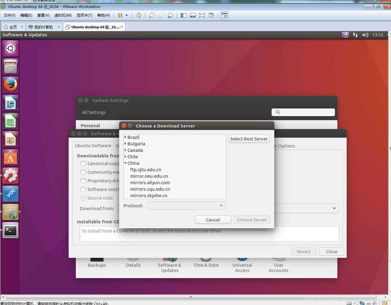 在Ubuntu software下Download from中点击Other找China下的地址,找一个即可,确定,提示需要update时,确定下。但我在下载时进行到一般失败(且下载慢),预测跟http及https有关。
