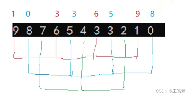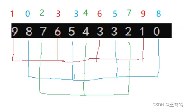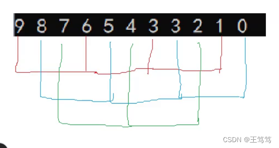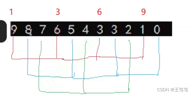 可以看到gap为三时,红色线标注的9,6,3,1为一组数;蓝色线标注的8,5,3,0为一组数,最后用绿色线标注的7,4,2为一组数;