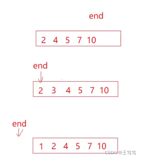 而第二种写法的思路是多组并排,也就是控制通过控制 i 来控制end, 也就是分别将每一组的第一个数据排好再去排每组的第二个数据,再去排每组的第三个数据以此类推,照图示来说就是先排1,再排0,再排2,在排3,3,4,6,5…………