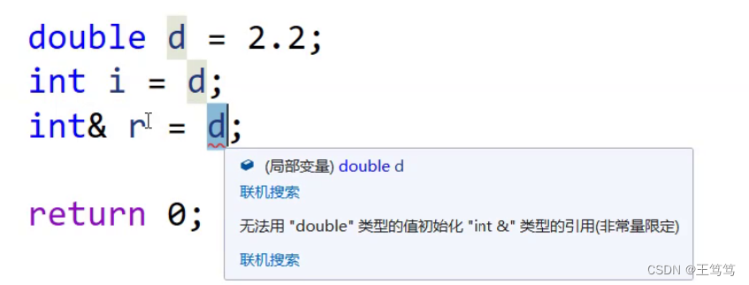 比如这里d时double类型,double和int类型相似,都是用来记录数据的类型所以可以发生隐式类型转换,但是转化时会产生中间变量,
