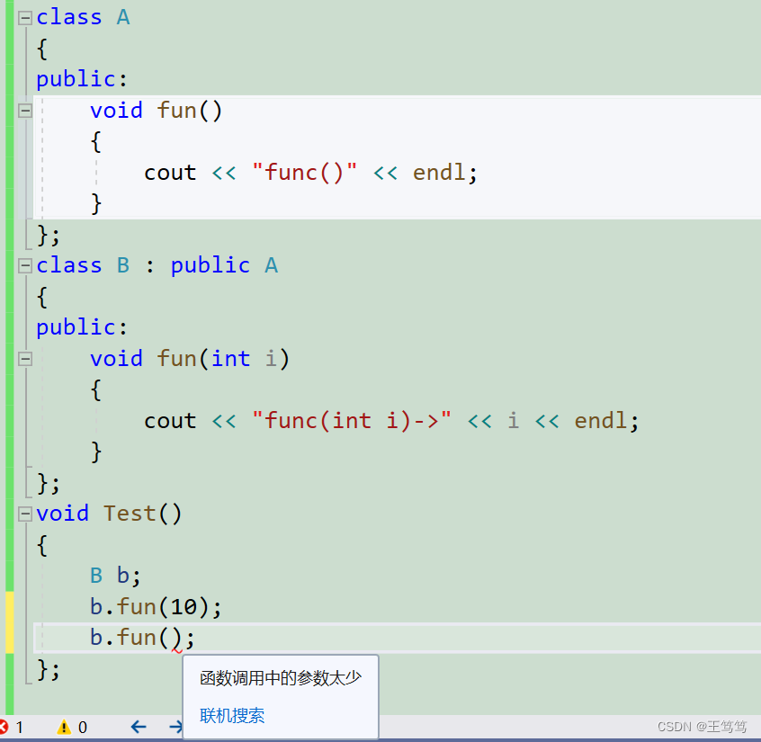 可以看到它的错误为函数中的参数太少,因为父类的函数是无参的,并且与子类中的函数同名,于是便对父类中的fun函数进行了隐藏;