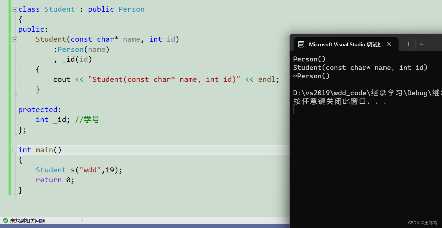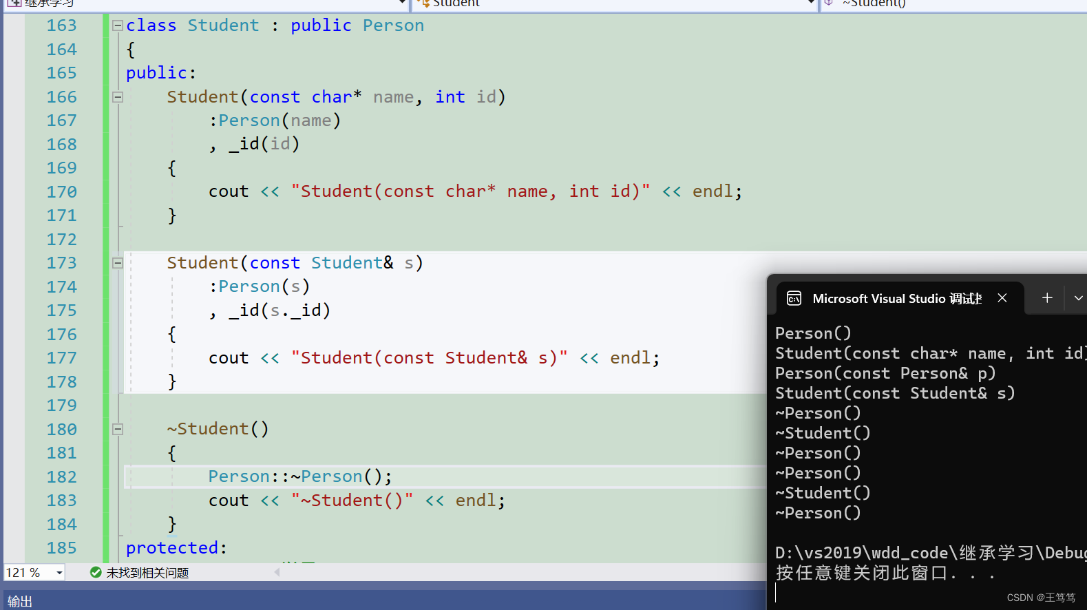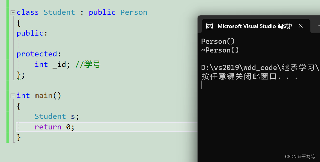 可以看到的是1.我们使用子类继承了一个父类2.使用子类创建了一个对象3.在子类中定义任何的构造函数和析构函数4.输出的结果中出现了父类的构造和析构函数