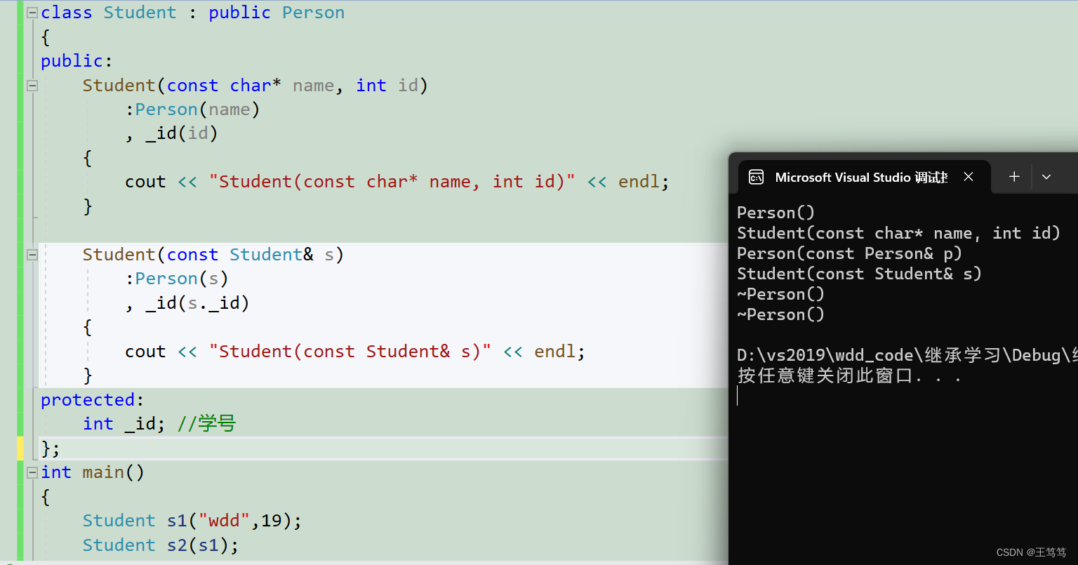 这里的原因是因为这里子类(Student)是有两部分构成的,一部分是子类本身的结构,另一部分是继承了父类的结构,接下来观察父类的构造函数和析构函数