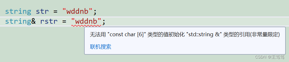 在这里可以看到使用引用会报错,原因是因为这里的r引用的是隐式转换的中间变量,但是中间变量具有常性,所以需要加const才能完成转换;