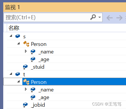 通过调试后的监视窗口我们可以看到在使用继承之后,子类创建的对象都具有父类的属性。