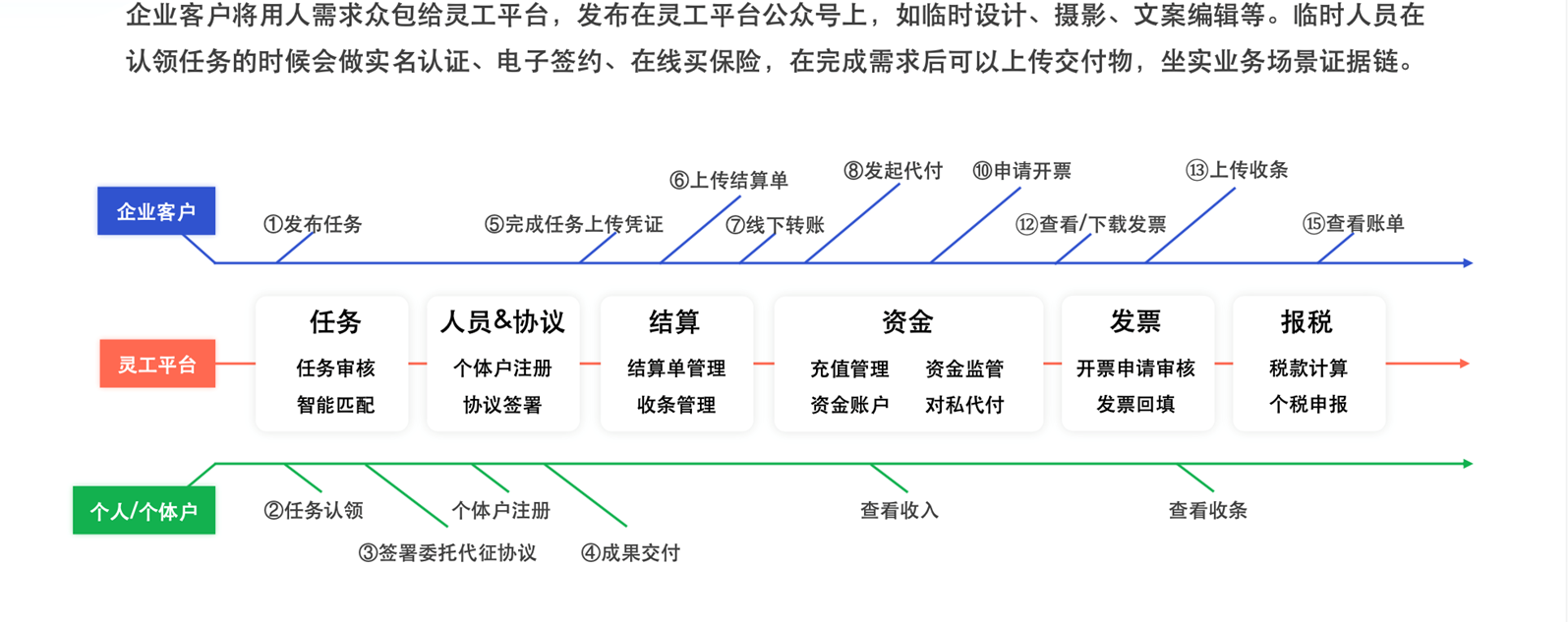 以众包形式为代表的灵活用工特点:平台型发包、个人主动认领,经营所得,个人主动提供生产资料,工作时间自由,自负盈亏。业务流程设计如下: