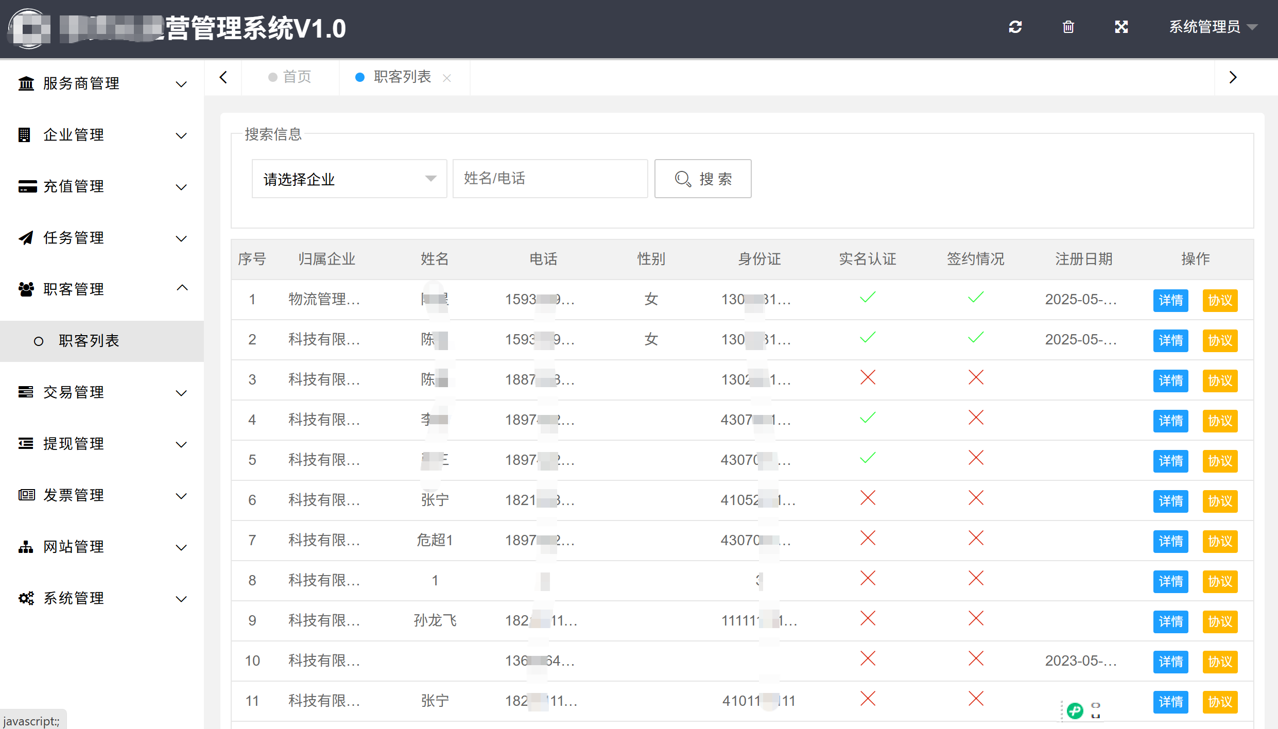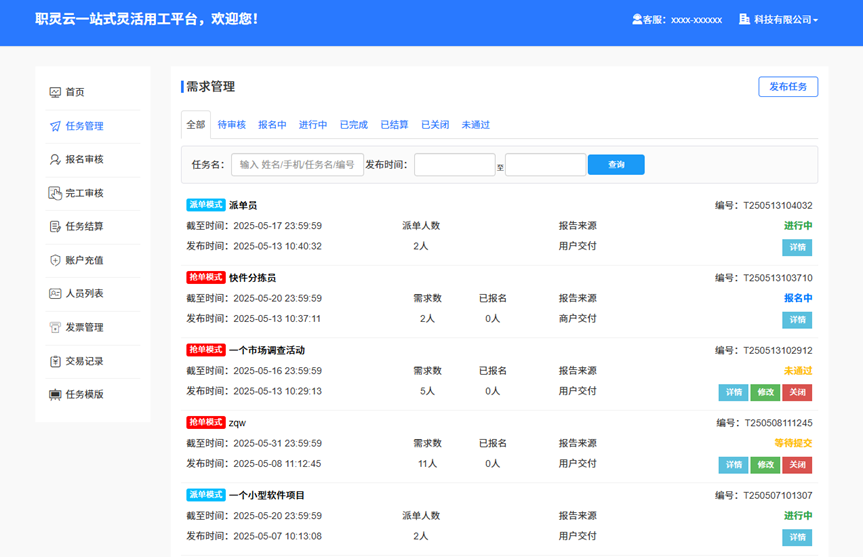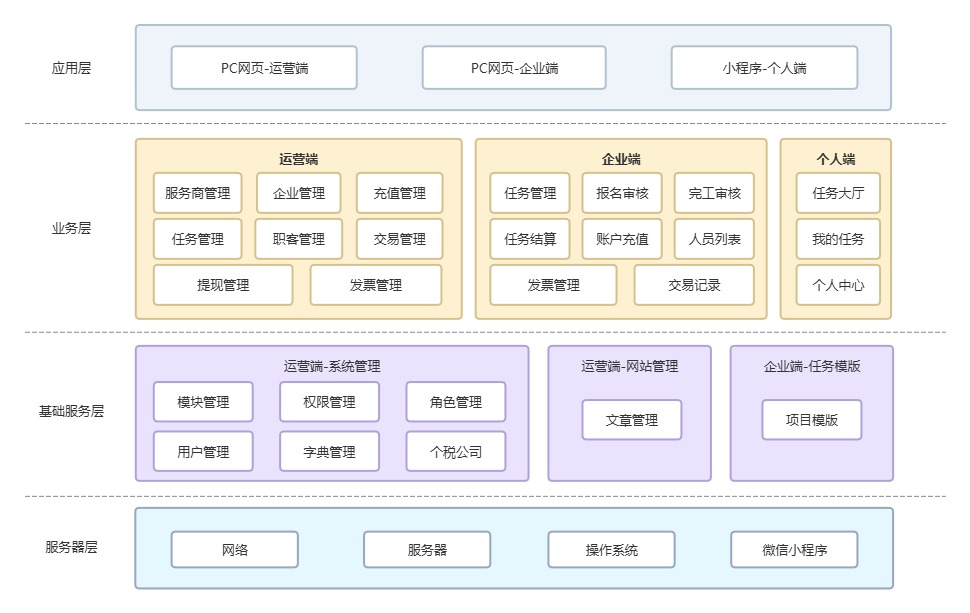 平台基于.net开发,数据库为MySQL,包括官网+管理端+企业端+小程序端(灵工端)