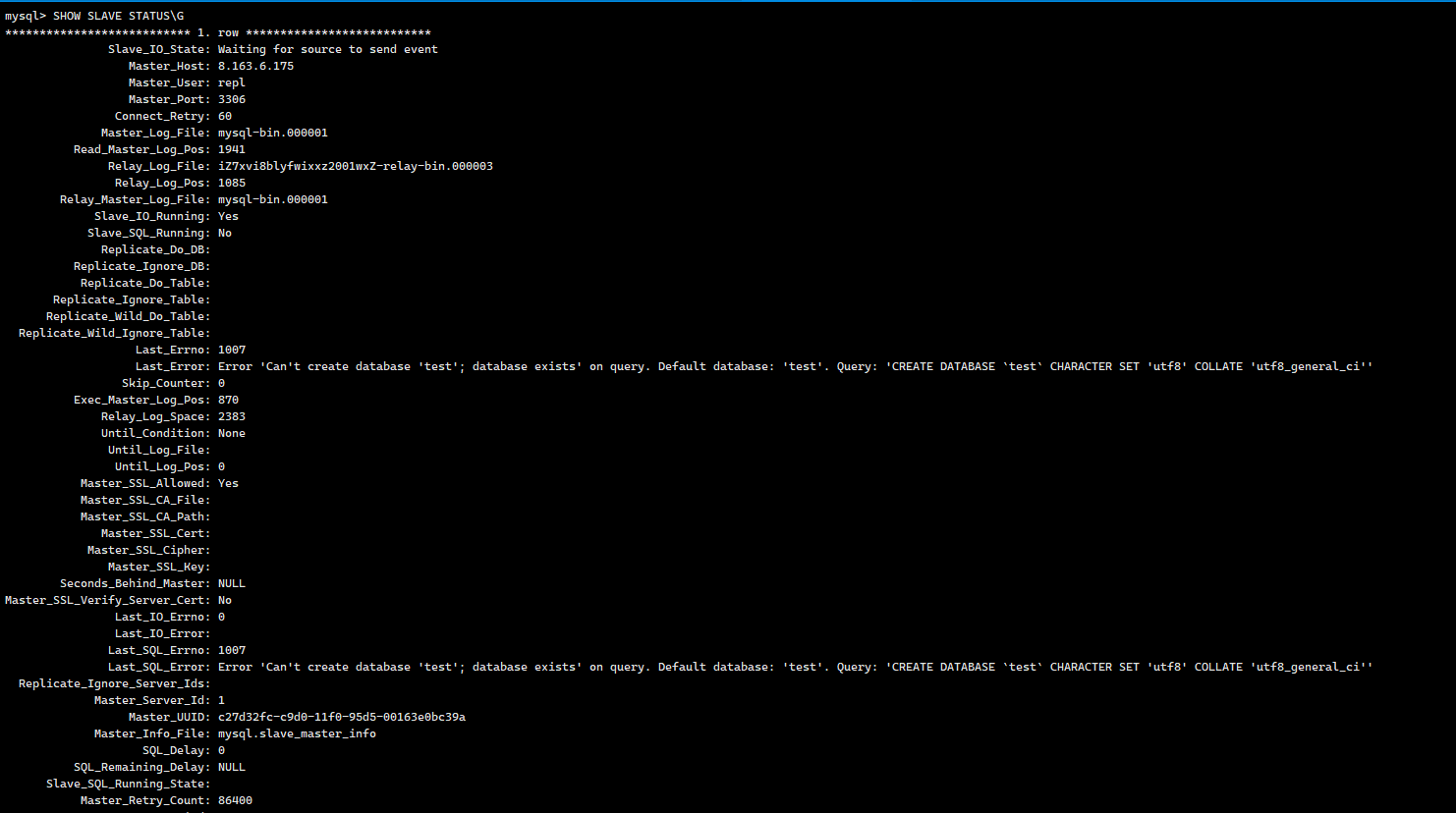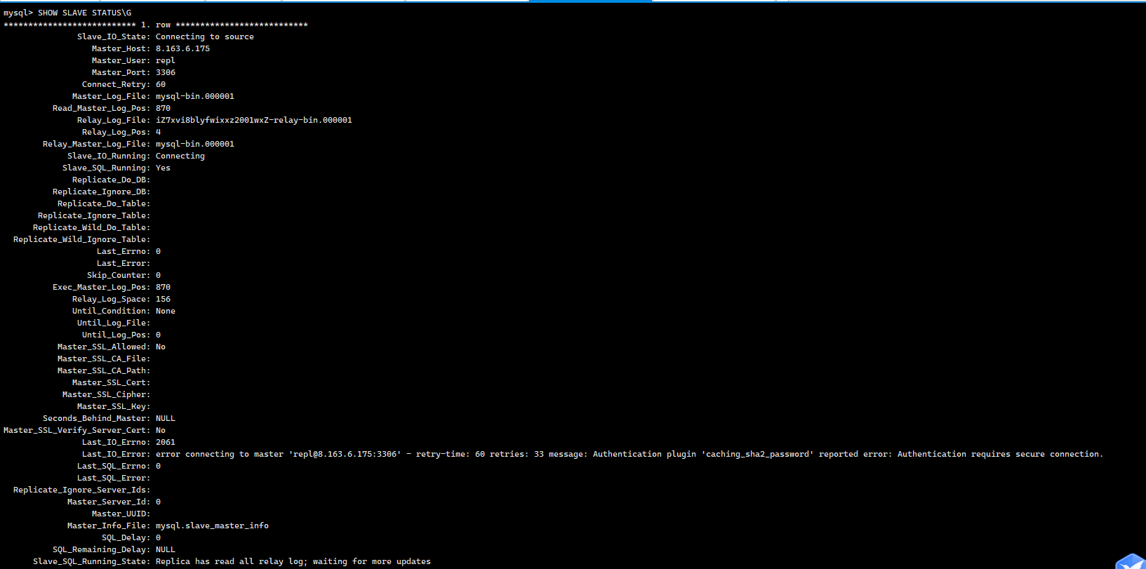 STOP SLAVE; CHANGE MASTER TO MASTER_HOST='8.163.6.175', MASTER_USER='repl', MASTER_PASSWORD='YourPassword', MASTER_PORT=3306, MASTER_SSL=1, -- 启用 SSL MASTER_SSL_VERIFY_SERVER_CERT=0, -- 不验证服务器证书(如无正式证书) GET_MASTER_PUBLIC_KEY=1; -- 获取公钥用于认证 START SLAVE;