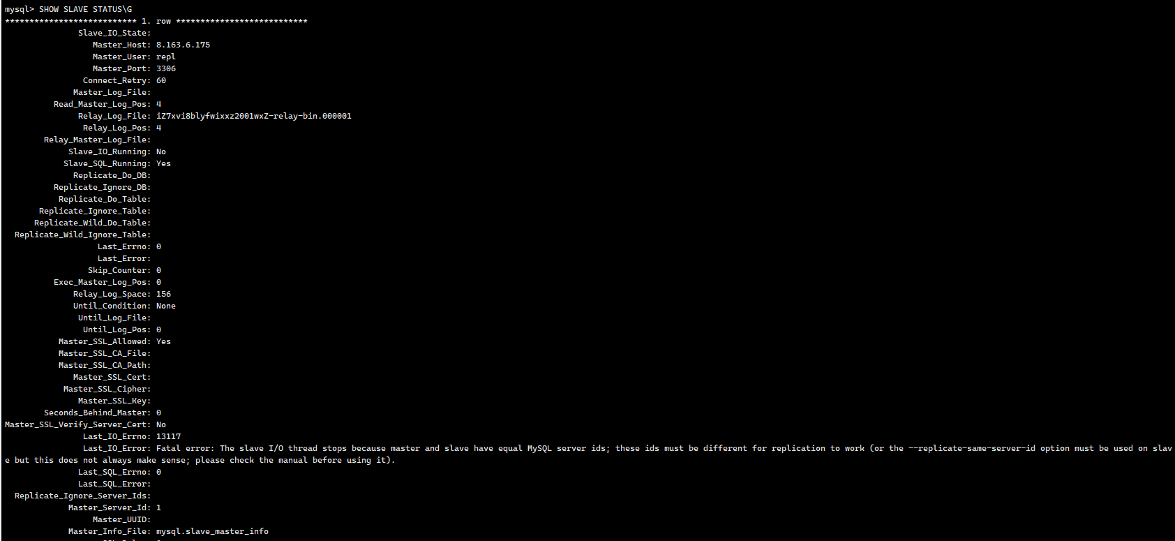 注意:提示从节点的 server-id 相同,这是因为从节点添加了 配置,没重启数据库的原因: