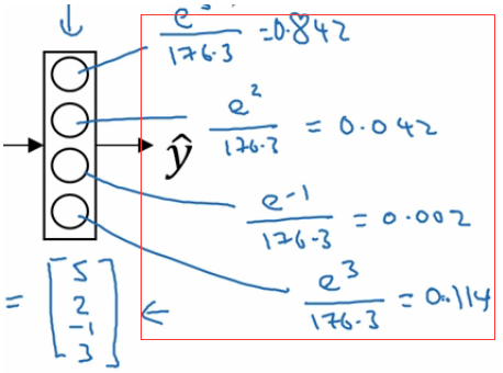 我们最后的一层中使用的激活函数就是softmax。 我们发现跟二分类在输出层之后一个单元不同的是, 使用softmax的输出层拥有多个单元,实际上我们有多少个分类就会有多少个单元,在这个例子中,我们有4个分类,所以也就有4个神经单元,它们代表了这4个分类。在softmax的作用下每个神经单元都会计算出当前样本属于本类的概率。如下: