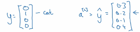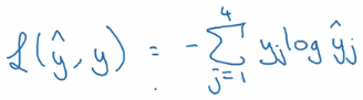还是假设有4个分类,那么实际的预测向量,也会有4个维度。 如上图左边的样子。 如果是属于第二个分类,那么第二个值就是1, 其他值都是0。 假设右边的向量是预测值, 每个分类都有一个预测概率。 那么我们的损失函数就是。