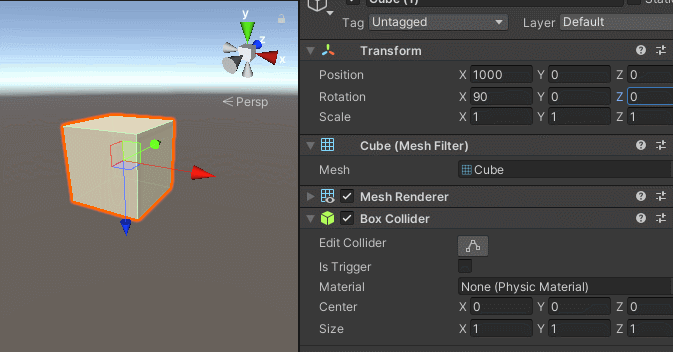 如何确定是正确的呢?我们可以创建一个Cube,然后通过按照y-x-z的顺序来调整值,这个是内旋的顺序,即每次旋转都是按照模型坐标来旋转的,因此每次旋转对应的模型旋转轴不会发生改变。如下: