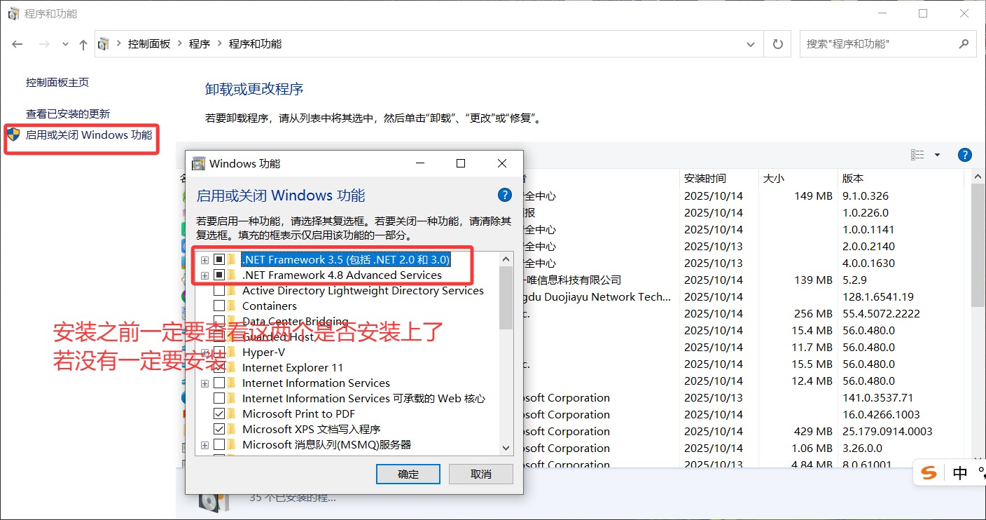 2.安装所需的Windows功能,在控制面板里面操作,如下图。