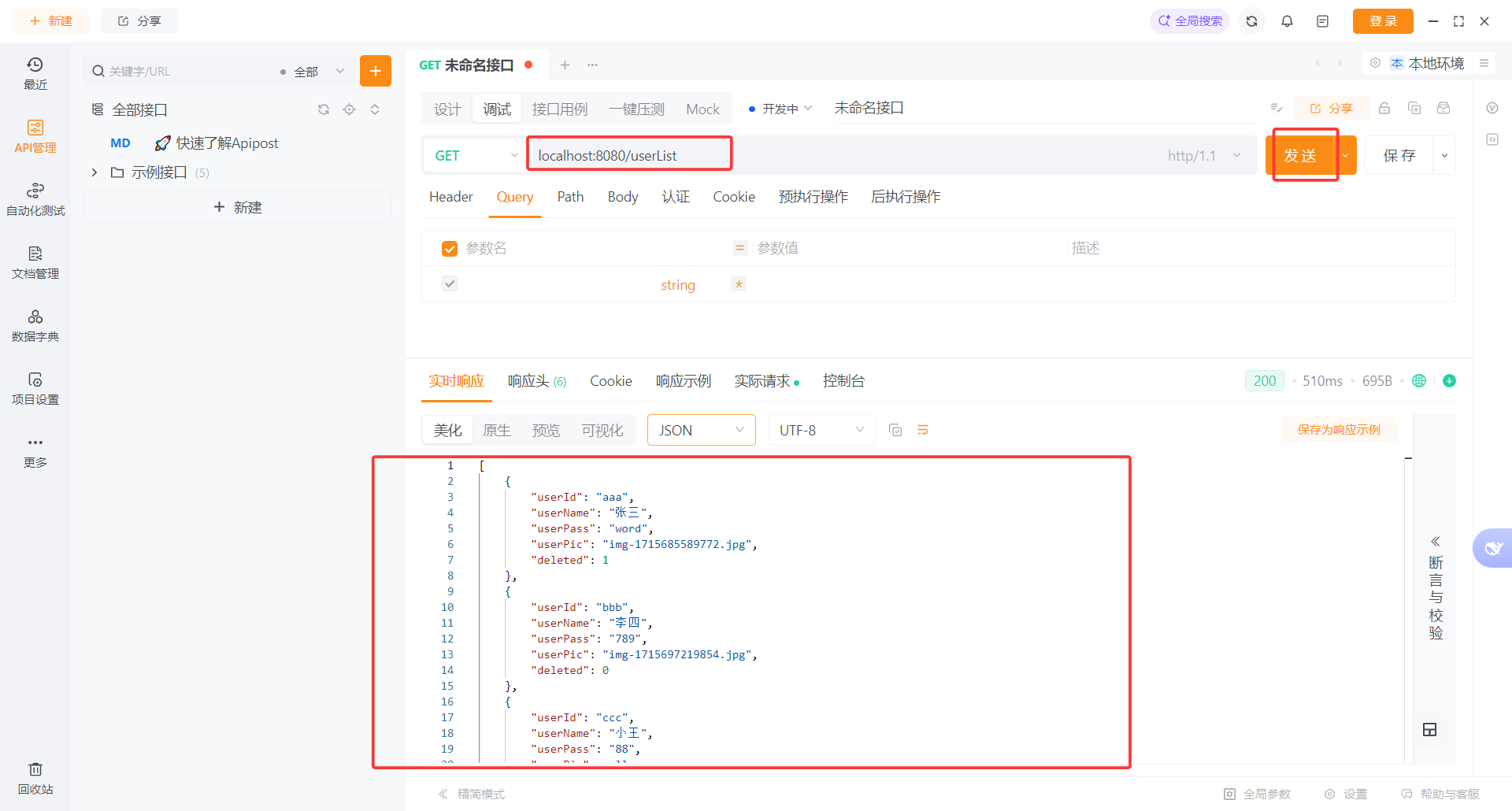 后端项目创建好后,运行起来,然后在Apipost软件上面输入地址进行测试,在此显示出数据库的数据,表示数据发送成功。