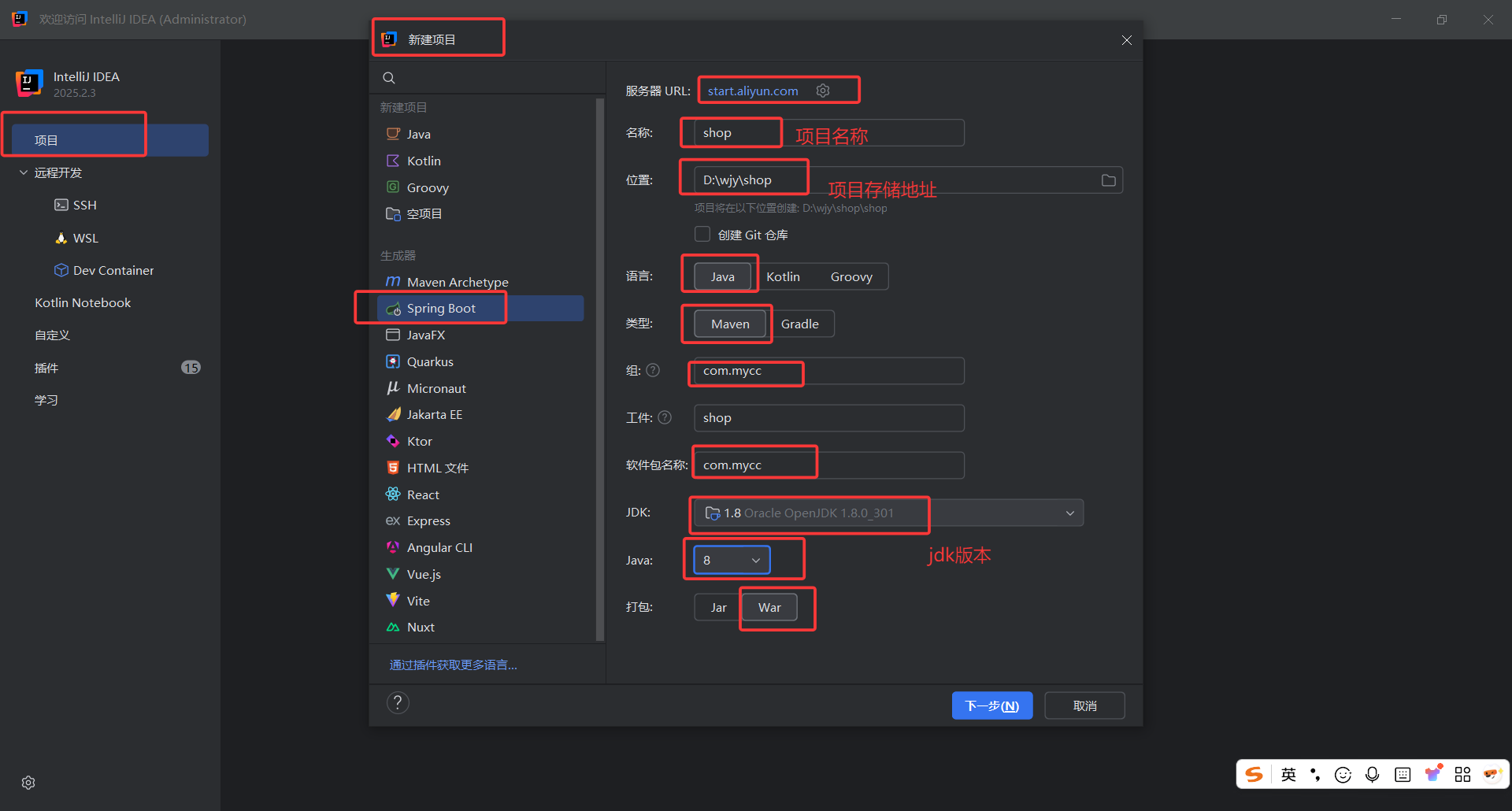 打开IDEA,新建项目,选择Spring Boot