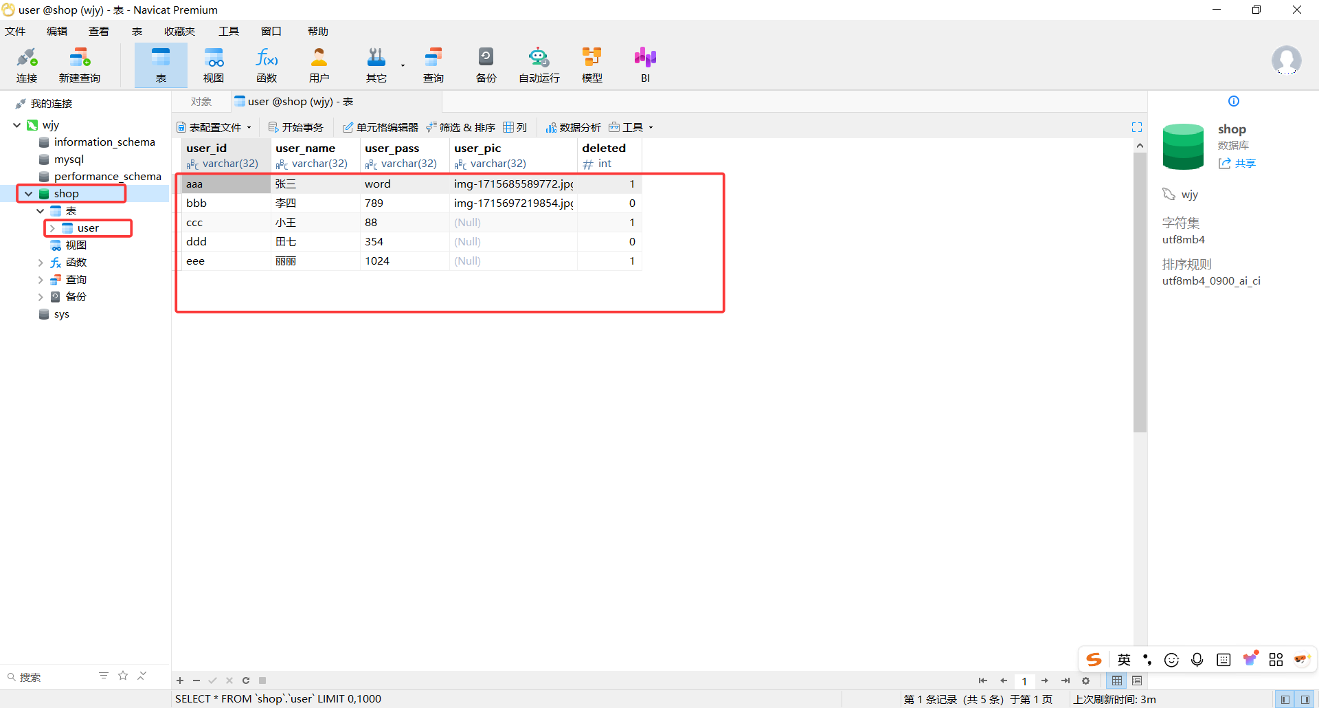 创建一个数据库shop,并创建一个user表,为该表添加上数据