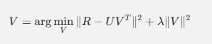 固定用户特征矩阵 UU,优化物品特征矩阵 VV: