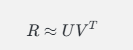 ALS的基本思想是将评分矩阵 RR 分解为用户特征矩阵 UU 和物品特征矩阵 VV,即: