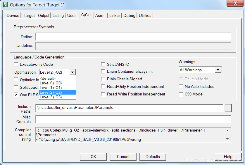 一般情况下采用default即O2等级的代码优化即可,如果采用O1、O2,则代码空间会变大,但会多很多调试信息,而使用O3的话有时候会对代码业务逻辑产生影响,所以一般采用O2等级进行优化代码。