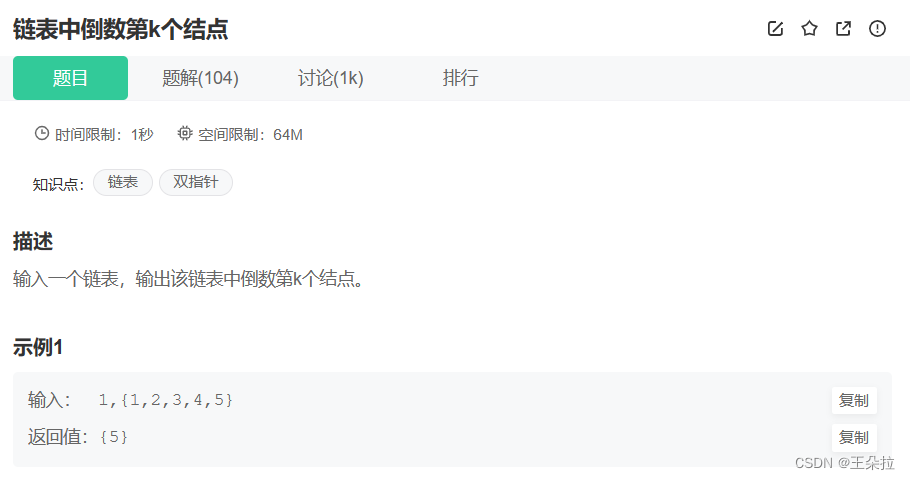 题目链接:链表中倒数第k个结点_牛客题霸_牛客网 (nowcoder.com)