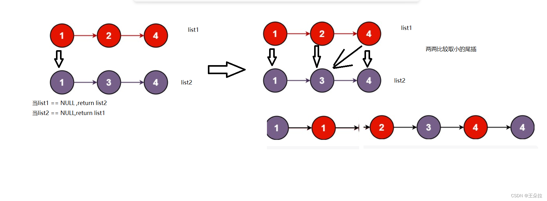 分析:首先这题要求是合并两个升序链表,可以考虑使用两个链表比较又因为是升序,所以采用取小尾插,如果是降序就是头插。当两个链表比较时,首先考虑链表为NULL,再进行两个链表比较,取小的尾插。