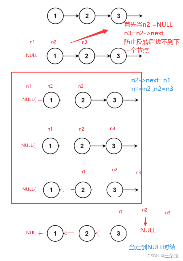第一个指针记录NULL,第二个指针记录head,第三个指针为第二个指针的next;