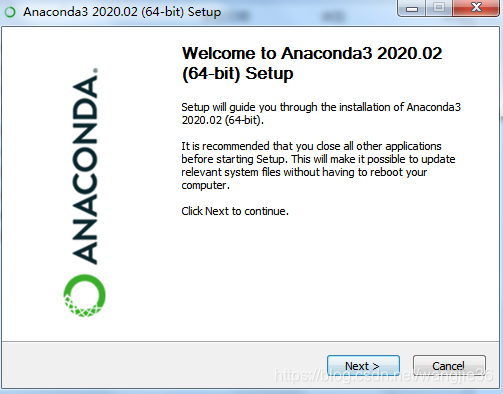 双击下载好的 Anaconda3-2020.02-Windows-x86_64.exe文件,出现如下界面,点击 Next 即可。