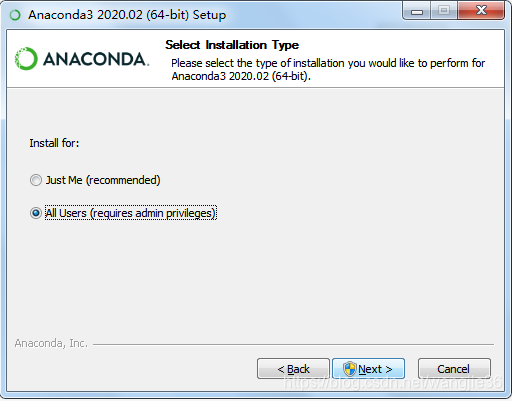 Install for: Just me还是All Users,假如你的电脑有好几个 Users ,才需要考虑这个问题.其实我们电脑一般就一个 User,就我们一个人使用,如果你的电脑有多个用户,选择All Users,我这里直接 All User,继续点击 Next 。