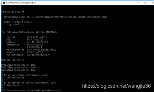 切换环境:activate learn,忘记了名称我们可以先用conda env list