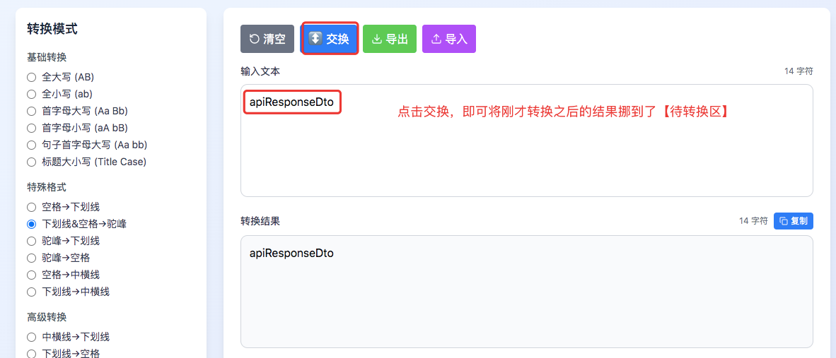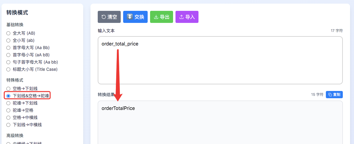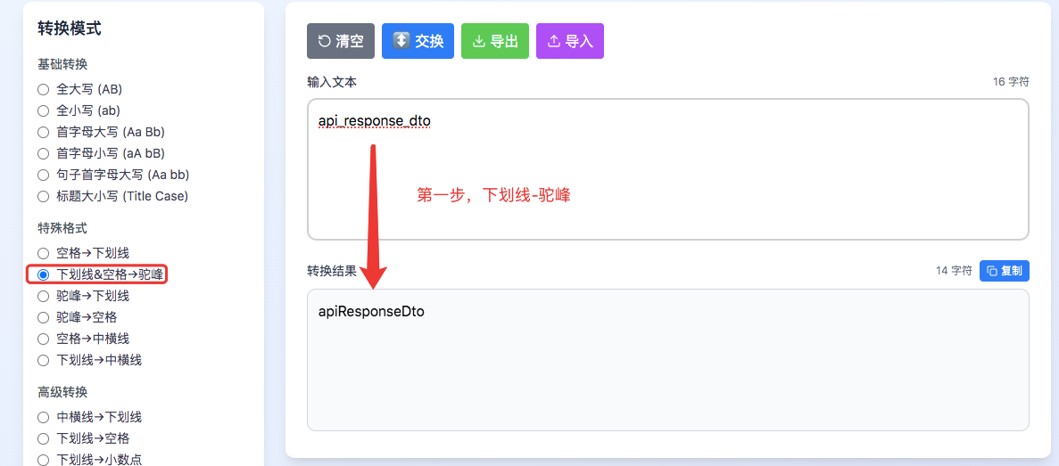1、将后端返回字符串整体复制到工具,选“下划线” → 驼峰”, 即可瞬间转换成功。